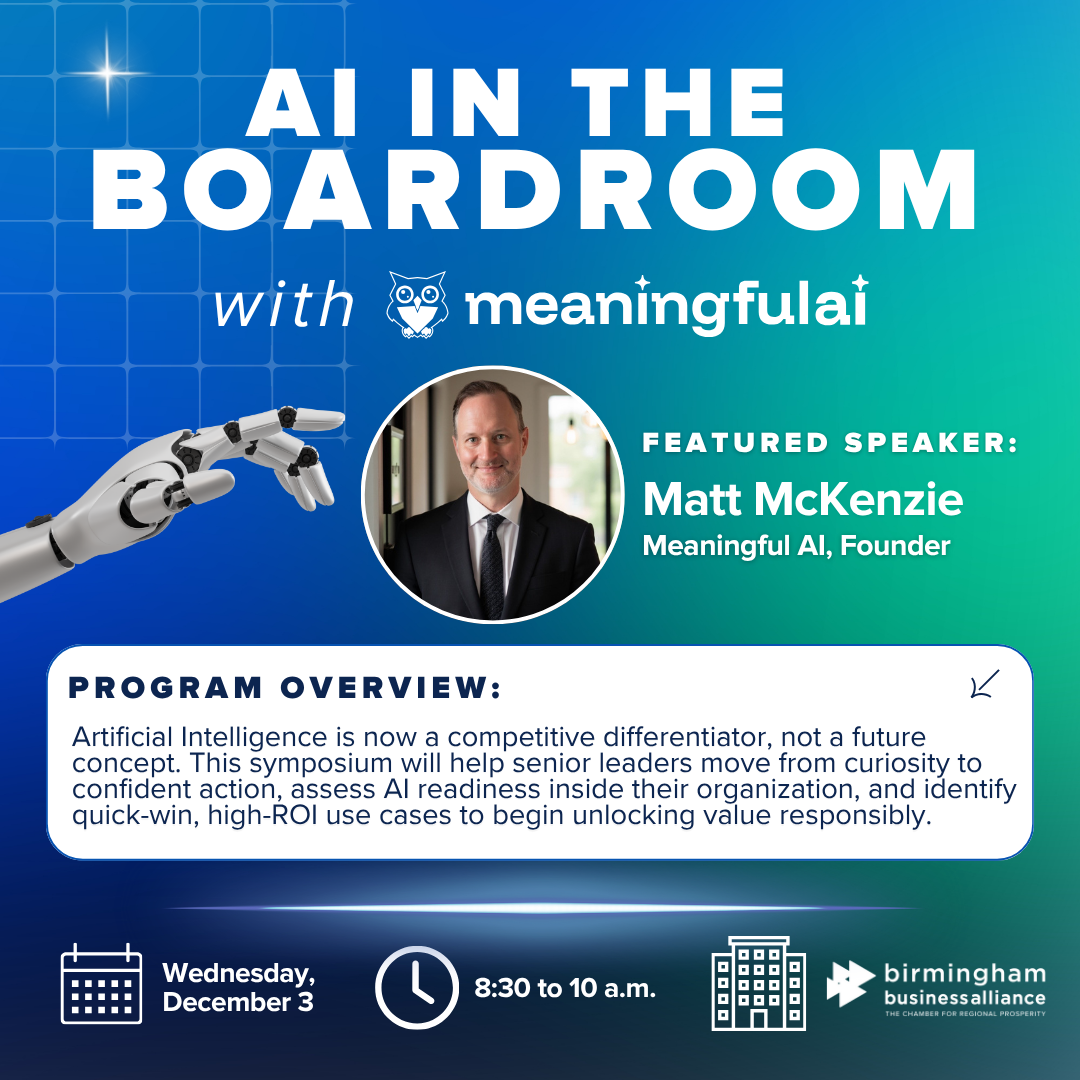 Artificial Intelligence is now a competitive differentiator, not a future concept. Join the Birmingham Business Alliance (BBA) on Wednesday, Dec. 3 from 8:30 to 10 a.m. for a 90-minute executive symposium in partnership with Meaningful AI, designed to help senior leaders move from curiosity to confident action, assess AI readiness inside their organization, and identify quick-win, high-ROI use cases to begin unlocking value responsibly.